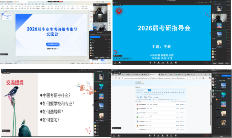 2025 年 10 月 12 日上午,中医药健康服务学院举办 2026 届毕业生考研报考指导交流会。此次交流会由学院就业工作负责人杜婧主持,2026 届全体毕业生因实习原因,齐聚线上,共同探寻考研报考的智慧密码。