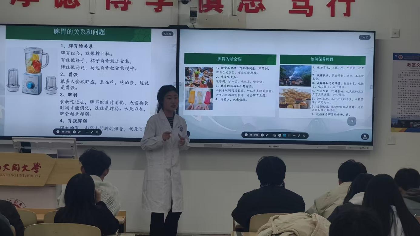 接下来的同学围绕脾胃养生核心知识展开讲解,从中医“脾为后天之本”的理论出发,详细介绍了脾胃虚弱的常见症状及成因,结合商院学子的生活节奏,分享了针对性的调理方案。包括商务宴请后的消食技巧、熬夜备考的脾胃养护方法、办公室穴位按摩操等,内容干货满满,实用性极强。