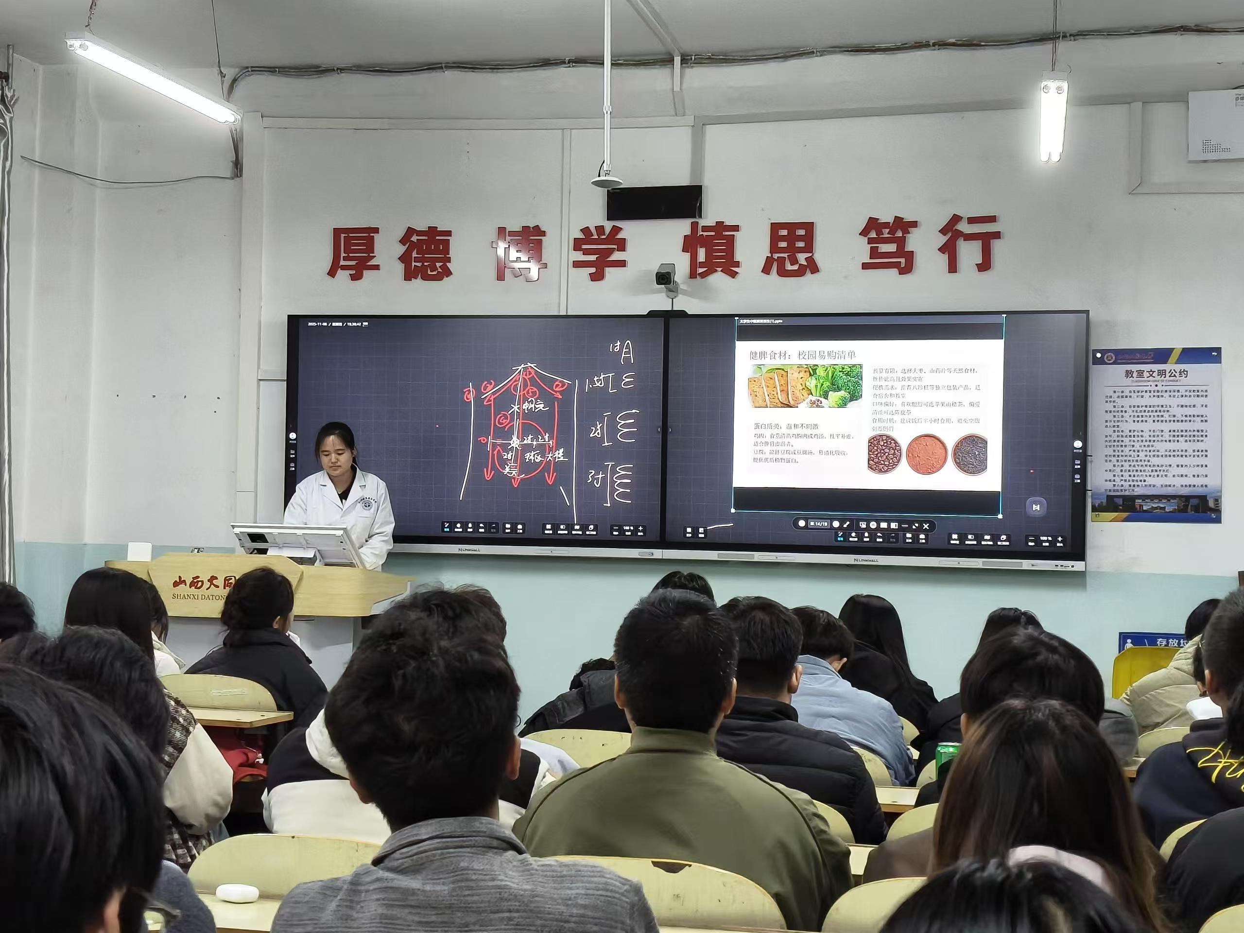 为传承中医药文化,普及脾胃养生知识,帮助大学生改善不良生活习惯引发的健康问题,11月6日,中医药健康服务学院“立春-张从正”医家组走进物理与电子科学学院,在明理楼115教室开展“大学生中医脾胃养生”主题宣讲活动。本次宣讲由曹佳欣、刘柯欣两位同学主讲,以“实用、易懂、可操作”为核心,为现场学子带来了一场兼具理论性与实操性的健康盛宴。