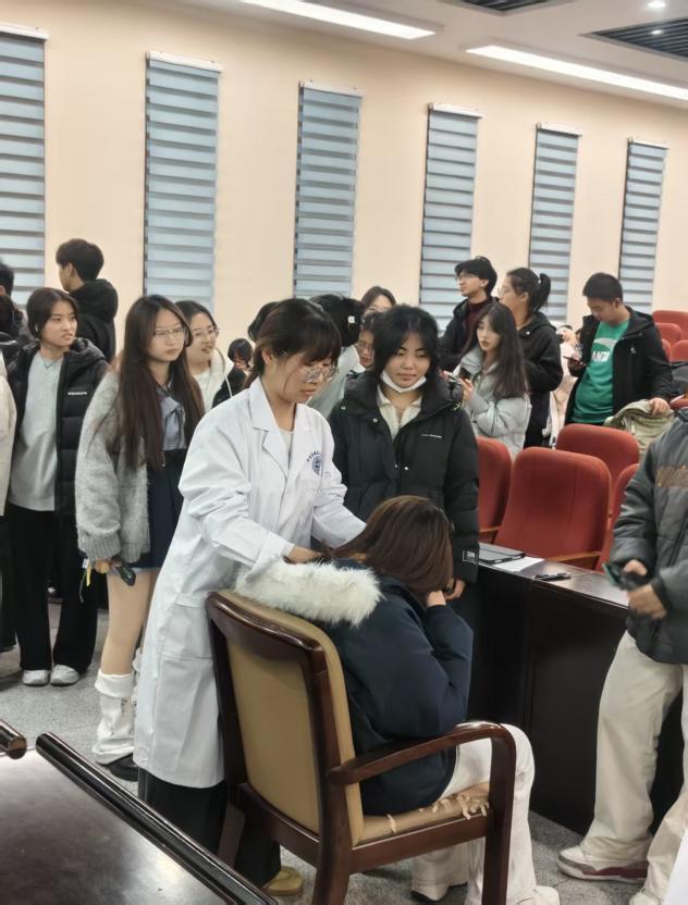 活动注重体验感,让中医“可触摸、可感知”。在针灸与耳穴体验环节,医家小组运用推拿和耳穴压豆帮助缓解疲劳,参与同学反馈“肩颈轻松了不少”。功法教学环节中,医家小组讲解八段锦“五劳七伤往后瞧”,结合运动拉伸,将“未病先防”理念融入日常锻炼。