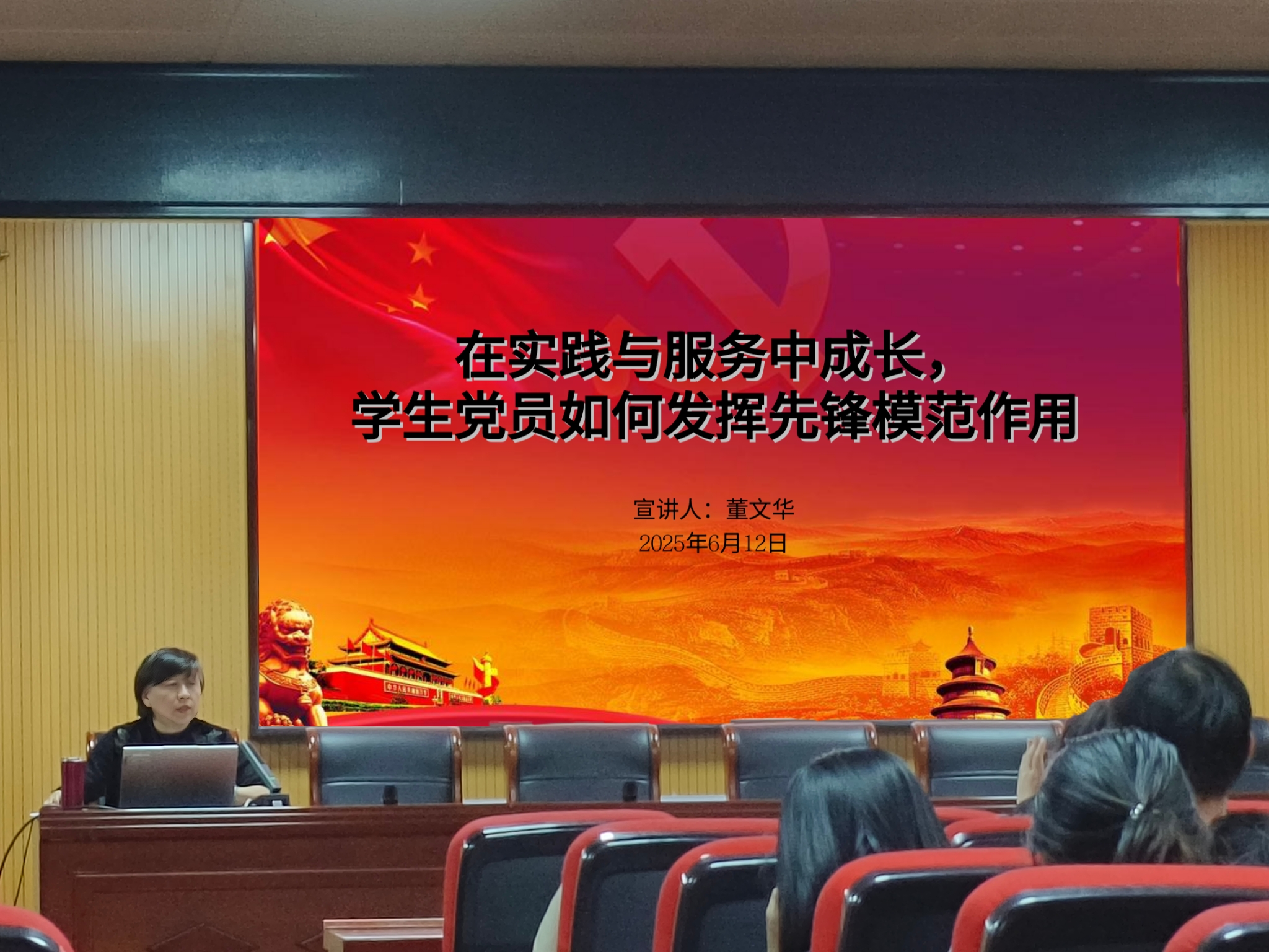 2025年6月12日下午三点,学院党委副书记董文华在仁和楼五楼报告厅,为中医系学生第一党支部、第二党支部全体成员主讲了题为“在实践与服务中成长——学生党员如何发挥先锋模范作用”的专题党课。